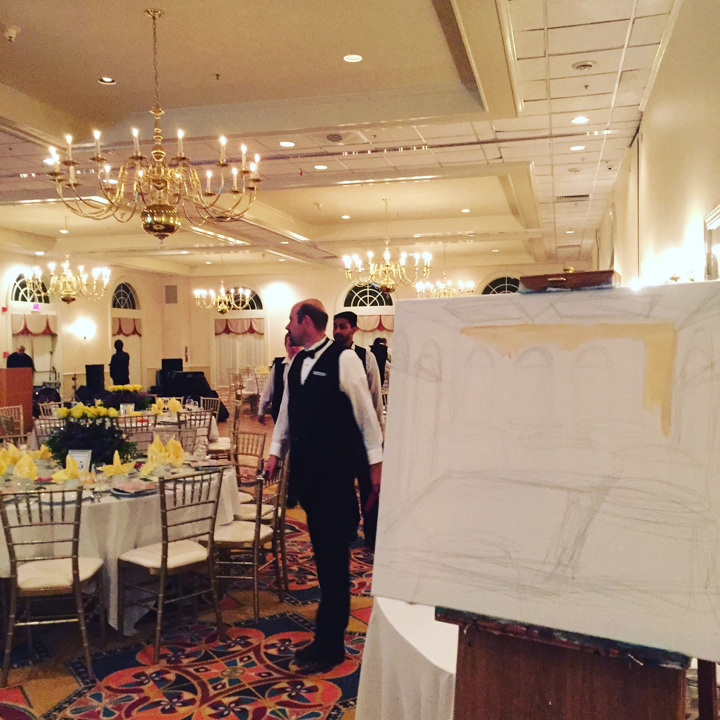 Last Saturday I did a live event painting of the Warminster Rotary Club Ball. I painted the space, which was the inside of Spring Mill Manor. The painting was up for a silent auction bid, hence the sign. The money raised from the event will be going towards a serenity garden at a children's hospice. Here is the before photo: